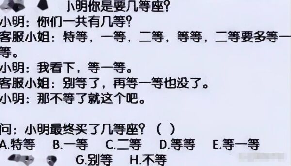 有简单的题目自然也会有一些“超纲题”,这道关于买票的试题不仅给外国学生看懵了,我们自己的学生也有点无从下手,到底最后小明买了几等座呢?
